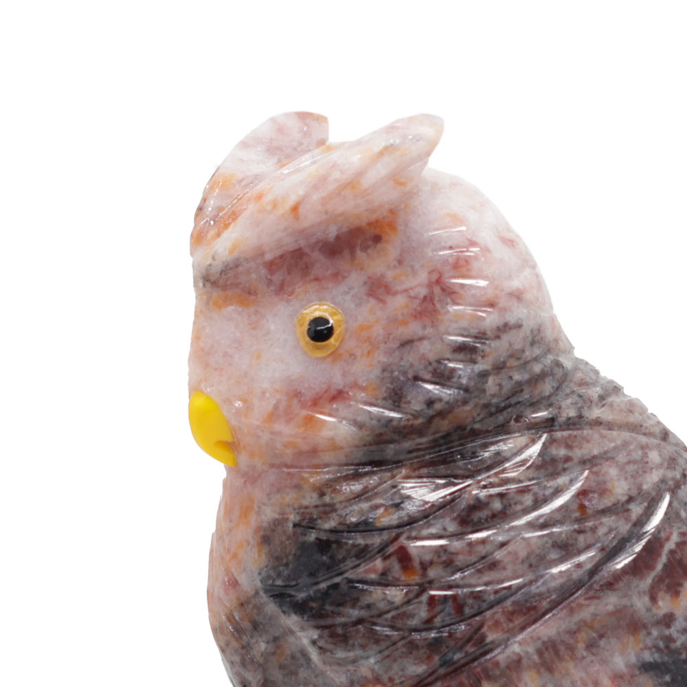 Búho de cuarzo dolomita rosa con detalles naranjas y gris (102Le)